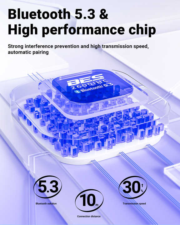 Bluetooth 5.3 – Conexión rápida y estable hasta 10 metros.