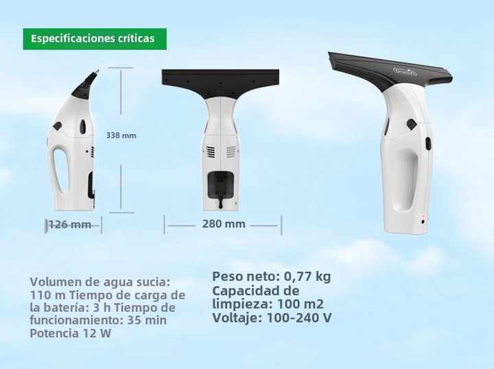 Este dispositivo combina aspirado de líquidos con limpieza de superficies planas, logrando una remoción total del agua sucia mientras deja el cristal seco y brillante. Gracias a su batería recargable, puedes usarla sin cables en cualquier rincón del hogar: ventanas, espejos, puertas de vidrio, mamparas de baño y más.