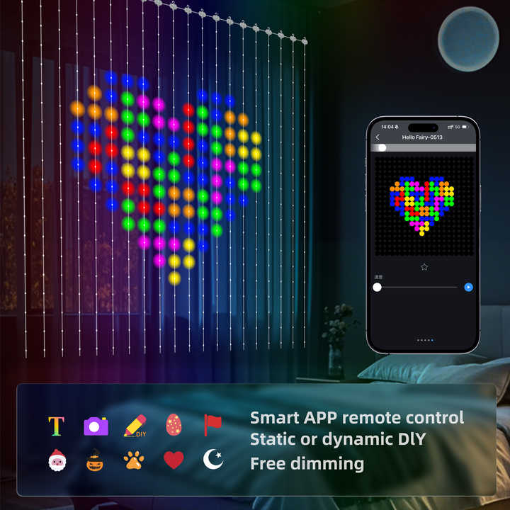 Fabricadas con materiales resistentes y de bajo consumo, estas luces son ideales tanto para interiores como exteriores protegidos, perfectas para fiestas, habitaciones gamer, bodas, escaparates o ambientaciones temáticas. Además, su sistema de instalación es fácil y rápido: solo cuélgalas, conéctalas y controla todo desde tu celular. 📲💡