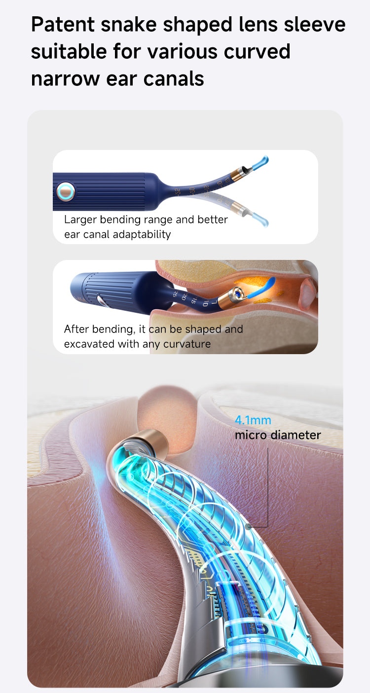 Su diseño moderno y minimalista 🧠 combina funcionalidad y tecnología en un solo dispositivo. Gracias a su microcámara de alta resolución 📸, podrás observar con precisión el interior del oído en tiempo real desde tu celular, permitiendo una limpieza más efectiva y segura.