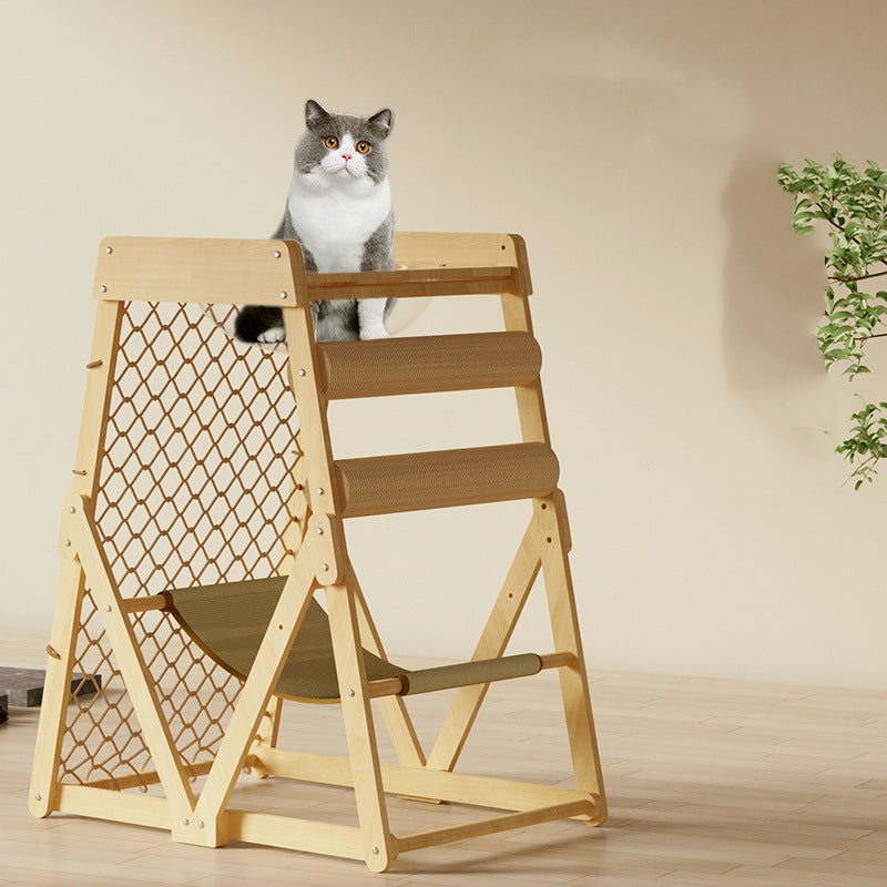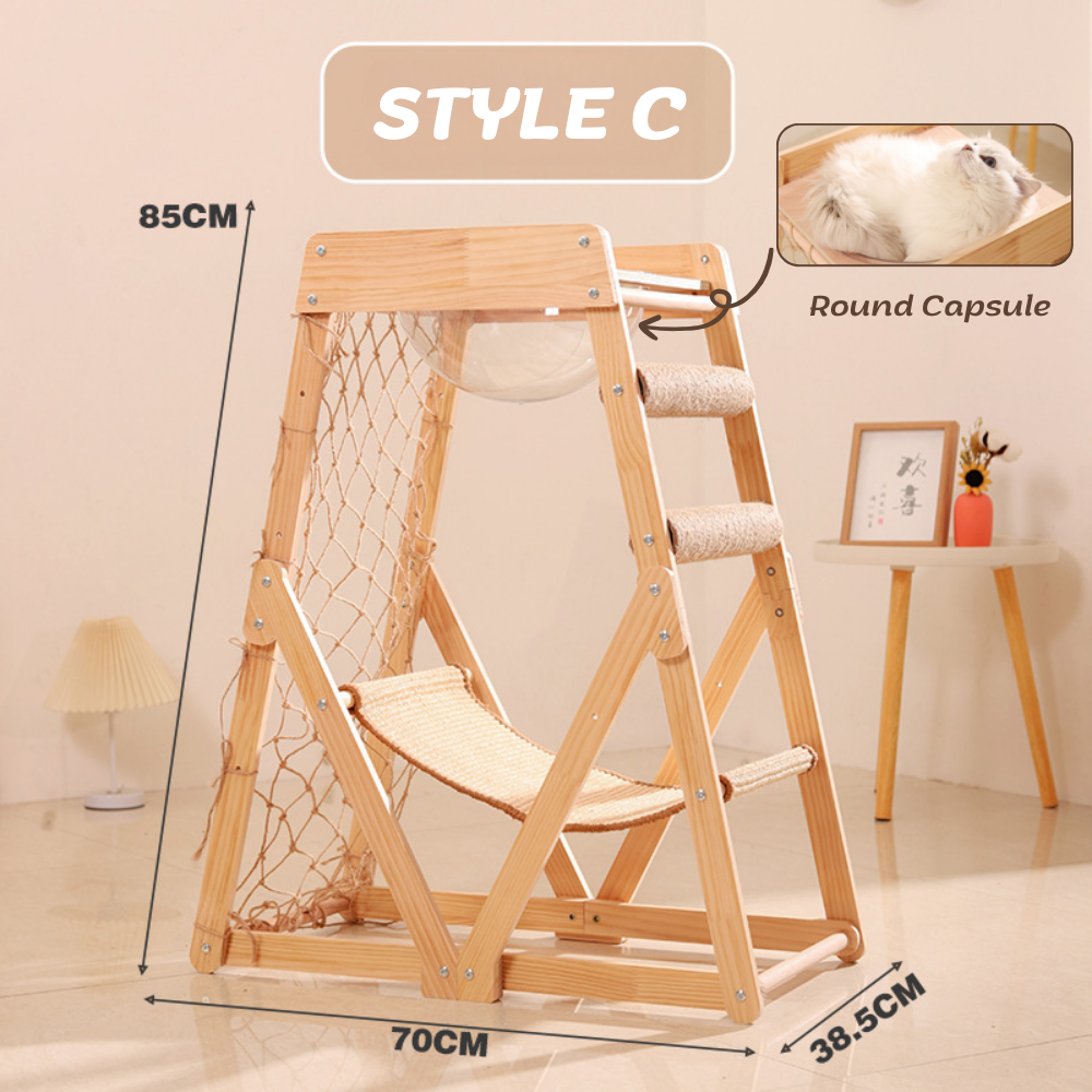Incluye plataformas amplias, hamaca, cápsula elevada y postes de rascado